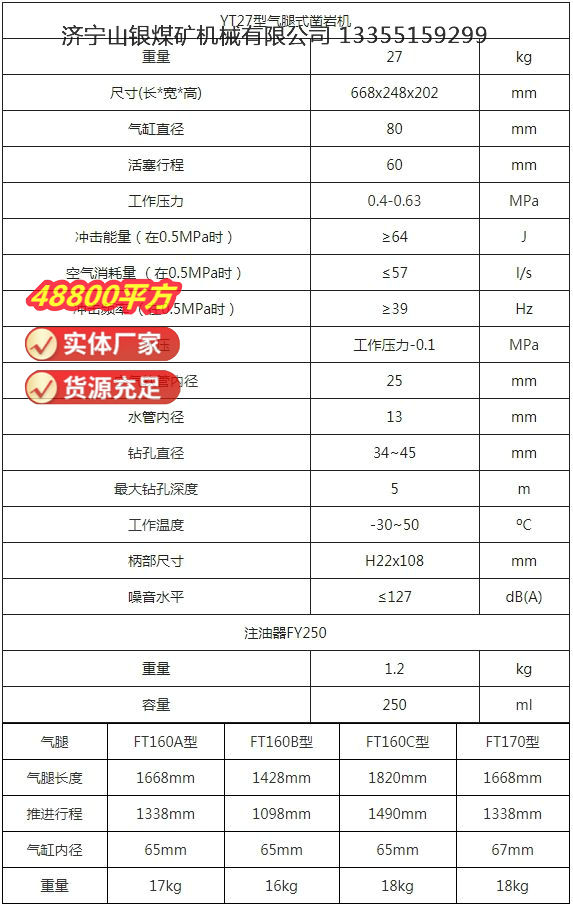 YT27型氣腿式鑿巖機適合在中硬和堅硬(f=8~18)巖石中的鉆水平和傾斜孔。孔徑范圍為34~45毫米,有效的鉆孔深度可達 5 米。根據不同的隧道掘進和作業條件可以與 FT160A型氣腿、FT160B型短氣腿、FT160C型長氣腿配套使用,金屬礦山還可配套FT170型氣腿,也可與鉆車或鉆架配套使用進行干式或濕式鑿巖。